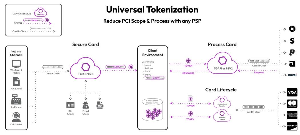 By tokenizing and vaulting with IXOPAY, you can transact across payment channels with all of your payment partners. Universal Tokens centralize payment data, providing full access and operability without the liabilities of directly accessing sensitive payment information.